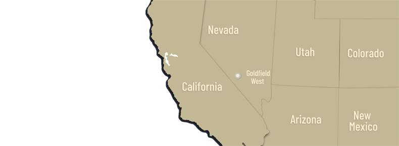 Goldfield West lies just west of the Goldfield collapse caldera, which is approximately 8 kilometres in diameter. The caldera is built within Tertiary volcanic rocks, mostly andesite, rhyolite, and ash-flow tuffs built on a basement of Lower Paleozoic, deep-water, marine sedimentary rocks. High-grade gold, often exceeding 33 g/t gold, was produced from a large number of shallow shafts and adits within the caldera proper, mainly in 1905-1920. District production was reported to be more than 4.0 million ounces of gold.
